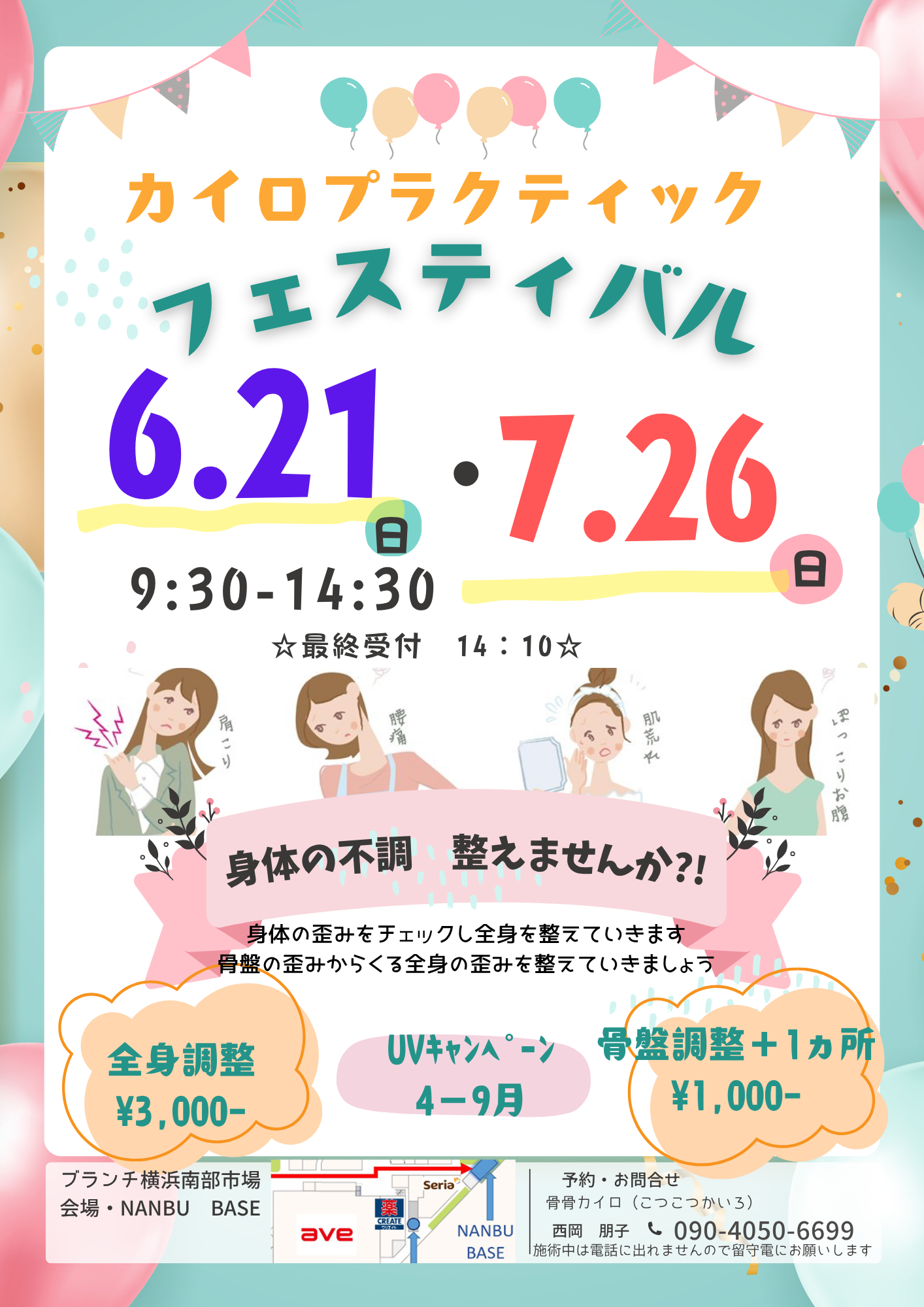 - 全身調整 \3,000-/骨盤調整+1ヵ所 \1,000-